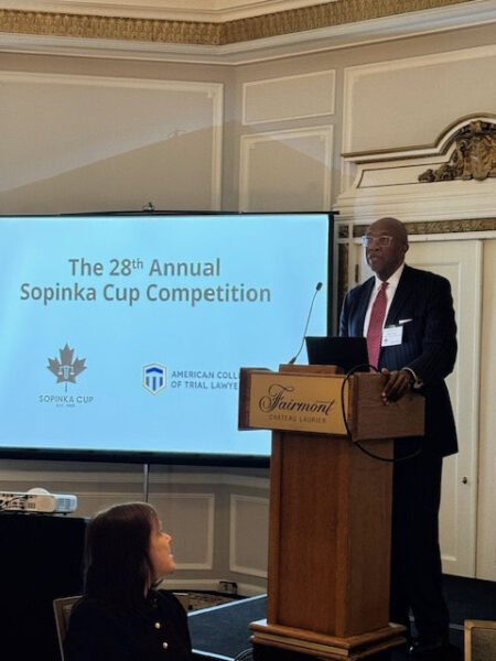 Immediate Past President Deane traveled to Ottawa to participate in the Sopinka Cup Competition, a trial competition honoring Canadian Supreme Court Justice John Sopinka, whose remarkable career spanned professional football, music, and high-profile litigation before his appointment to the Court. The visit began with a reception at the Supreme Court of Canada, hosted by Justice Suzanne Côté, who welcomed attendees and led a tour of the courthouse. Dinner followed at the historic Rideau Club. On Saturday, Immediate Past President Deane served as a feedback provider for the final round of competition, where the students demonstrated exceptional skill in a complex criminal case. That evening’s reception and dinner included a moving tribute to Justice Sopinka, with remarks from his daughter, Justice Melanie Sopinka, and others highlighting his legacy. Immediate Past President Deane also offered remarks on behalf of the College, praising the competition and its participants. This year’s Best Overall Advocate was Zachary Currie from the University of British Columbia and the Winning Team was Yuliana Kovalenko and Jacob Manirakiza from McGill University. The quality of the advocacy during the competition was excellent, and the importance of the competition to the jurists, lawyers, coaches and students was apparent throughout.